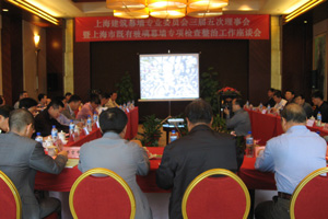 郏祥钧秘书长则就协会配合专项检查整治工作的情况作了汇报。自2006年起,受市建交委和房管局委托,即设立专项咨询电话和网站;2006年-2008年,还根据主管部门要求,成立了11个建筑幕墙现场检查组和34家建筑幕墙维修企业,700多名专业检查、维修专业人员。这些企业都作好准备,希望在专项检查整治工作现阶段(整改阶段)和下阶段(巡查阶段)的工作中贡献自己的一份力量。