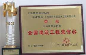 上海铁路南站是国家重大工程,也是上海市重要的对外窗口。由蓝天公司中标的1#标段包括7.5米层大平台、9.9米层大平台、含层面栏杆和两层之间的斜坡道饰面及9.9米平台外2.5米宽人行道;面积37268平方米、造价1483万元。该工程荣获2006年(第四届)上海优秀石材建设工程专业工程类“金石奖”,2007年全国建筑工程装饰奖。