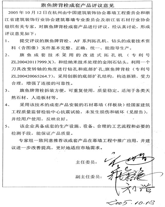 公司通过数年的研发,创造出一整套专业的后切式锚固技术,产品经国家工程质量监督检测中心抗震(抗11级地震)检测一次性通过试验,并得到了国家幕墙专家的一致好评,解决了石材(陶瓷板)幕墙施工对建筑物高度过高、安全性能指标达不到要求、施工工艺复杂、人为不稳定因素多、不能工厂化生产的诸多问题,可广泛运用于幕墙业、装饰业等建筑行业领域之中。是具有当代先进水平,引领潮流的施工技术。 |
